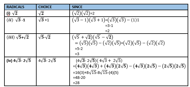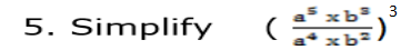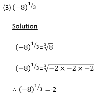 Form 2 Mathematics – EXPONENT AND RADICALS msomimaktaba, November 13, 2018August 17, 2024 EXPONENT AND RADICALS EXPONENTS:– Is the repeated product of real number by itselfe.g. i) 2 x 2 x 2 x 2 = 24ii) 6 x 6 x 6 x 6 x 6 = 65iii) a x a x a x a x a = a5LAWS OF EXPONENTS MULTIPLICATION RULESuppose; 4 x 4 x 4 = 43Then, 43 = power4 = base3 = exponentSuppose, 32 x 34 = 3(2+4) = 3632 x 34 = 3 x 3 x 3 x 3 x 3 x 3 = 36 Example 1 Simplify the followingi) 64 x 68 x 66 x 61ii) y4 x y0 x y3 Solution:i) 64 x 68 x 66 x 61 = 6 4+8+6+1= 619ii) y4 x y0 x y3Solution:Y4 x y0 x y3 = y4+0+3= y7Example 2 Simplify the followingi) 32 x 54 x 33 x 52ii) a3 x b3 x b4 x a5 x b2Solution:i) 32 x 54 x 33 x 52 = 32+3 x 54+2= 35 x 56ii) a3 x b3 x b4 x a5 x b2 = a3+5 x b3= a8 x b9Example 3If 2Y x 16 x 8Y = 256, find ySolution:2y x 24 x 8y = 2562y x 24 x 8y = 282y x 24 x (23)y = 28y + 4 + 3y = 8y + 3y = 8 – 44y = 4Y = 1Exercise 1:1. Simplifyi) 34 x 43 x 38 x 34 x 42 = 34+8+4 x 43+2 = 316 x 45ii) a2 x a3 x a4 x b2 x b3 = a2+3+4 x b2+3 = a9 x b52. If 125m x 252 = 510 find mSolution:125m x 252 = 51053m x 54 = 5103m + 4 = 103m = 10 – 43m=6m = 23. If x7 = 2187. Find xSolution:X7 = 2187 X7 = 37X = 3QUOTIENT LAW= = 3 X 3= 32Also = 34-2 = 32Generally: Example 1.Find i) = 87-5 = 82ii) = 52n-n = 5nExample 2.If = 81 find nSolution:= 81() = 3433n – 4 = 34Equate the exponents 3n – 4 = 4n= NEGATIVE EXPONENTSSuppose = 32 – 4 = 3-2Also = = and Inversely xn = ExampleFind( i) 2-3 = = (ii) 9-1/2 = (iii) = 33 = 27EXERCISE 2 1. Given 23n x 16 x 8n = 4096 find n2. Given = 56 find y3. If 32n+1 – 5 = 76 find n4. Given 2y = 0.0625.Find y 6. Find the value of x(i). 81-1/2 = xii) 2-x = 8ZERO EXPONENTSSuppose,= = 1 30 = 1 ExampleShow that 90 = 1Consider = = = 1Also = 92-2 = 9090 = 1 hence shownAlso(i) m = (ii) (x y)m = xm ym Example(1)Find i) (5 x 4)2Solution:(5 x 4)2 = 52 x 425 x 5 x 4 x 4 = 400ii) ()3= = 2. Show that 2-1 = Solution:2-1 = = consider LHS2-1 = L H S = R H STherefore2-1 = hence shownFRACTIONAL EXPONENTS AND EXPONENTS OF POWERSEXPONENTS OF POWERSConsider (54)3=(5x5x5x5)3 =(5x5x5x5)x(5x5x5x5)x(5x5x5x5) =5x5x5x5x5x5x5x5x5x5x5x5 =512 Similarly (54)3=54×3 Examples: 1.Simplify (a (x4)5(b) (86)3Solution (a) (x4)5=x4×5 =x20(b) (86)3= 86x3 =8182.Write 23x 42 as a power of single number Solution 23x 42 ,but 4=22therefore 42=(22)2 42=22×2 =24 23x 24=23+4 ∴23x 24=27 FRACTIONAL EXPONENT SolutionConsider the exponents of powers when is squared, we get Let x be positive number and let n be a natural number. Then Examples:(1) Find Thus if x is a negative number, and n is an odd numberExercise 2.1. Show that 2-2 = Solution:Consider LHS2-2 = = 2-2 = LHS = RHS hence shown2. Evaluate272/3 x 729 1/3 ÷ 243Solution:27 2/3 x 729 1/3 ÷ 243(33)2/3 x (36)1/3 ÷ 35 32 x 32 ÷ 3532+2-5= 3-1 or 3. Find the value of m(1/9)2m x (1/3)-m ÷ (1/27)2 = (1/3)-3m Solution:(1/32)2m x 1/3-m ÷ (1/33)2 = 1/3-3m(1/3)4m x (1/3)-m ÷ (1/3)6 = (1/3)3m3-4m x 3-m ÷ 3-6 = 3-3m-4m + -m – 6 = -3m-5m – 6 = -3m6 = -2mm = -34. Given 2x x 3y = 5184 find x and ySolution:2x = 5184 2x x 3y = 26 x 3y2x = 26 By comparison2x = 26 2x = 26X = 63y = 5184 3x = 343y = 34y = 4The value of x and y is 6 and 4 respectively RADICALS-A number involving roots is called a surd or radical. -Radical is a symbol used to indicate the square root, cube root or nth root of a number. -The symbol of a radical is Example of Radicals (i) (ii) (iii)PRIME FACTORSExample 1Find (i) by prime factorizationSolution: = = 2×7= 14ii) by prime factorizationsolution: = = 2 x 3= 6iii) by prime factorizationsolution: = = 2 Example 2If = 8x find xSolution: = = 8x= (23)1/3 = 23x= 21 = 23xx= Exercise 31. Find the followingi) Solution = = 2 x 2 x 2 x 2 x 2= 32 =32ii) Solution = = 52. Simplifya) Solution = = 5 b) == 3 x 5 = 15 3. Find = 16y find y = = 24y2 2 = 24y2 = 4yy = 4. Find x if =491/3Solution = = 491/33431/x = 73/x = (72)1/373/x = 7 2/3= 2x = 9x =ii) = 81xsolution== 81x = 32 = 34x= 2 = 4xx = OPERATION ON RADICALADDITIONExample1.Evaluatei) +3Solution: + 3=(1 + 3) =4ii) + Solution=+(22)1/2 (32)1/2 + (22)1/2 (22)1/2 = (2 x 3) + (2 x 2) = 6 + 4 = 10 SUBTRACTIONExampleEvaluatei) 3 – 2 Solution= 3 n-2= (3 x 2 x 3 2 x 2 x 2 )= 18 8 = 10 ii) Solution = =(2 x 3) (2 x 2) = 6 4= 2 MULTIPLICATIONExampleFind i) x solution x = = = = 2 x 2 x 2 x 3= 24ii) 3 x 3Solution3 x 3 (5 x 3) x (3 x 3) = 15 x 9 = 135 DIVISIONExample 1Find i) Solution: = = = = EXERCISE 4.1. Find 2 + 3 Solution: 2 +3 = (2 x 2 x 3)+ (3 x 2 x 2)= 12 +12 = 24 (ii )3 Solution:3 = 3 + 3 = 3 + 3 =(3 x 2) +(3 x 2 x 3) = 6 +12 = 18 (iii) 6 2 Solution:6 2 6 = 2 = (6 x 2) (2 x 3) = 12 6= 6 iv) + Solution: + +3 4 (v) + 2250Solution: + = +2250= 2 + 2250=2 + 2250=2 + 22502. Simplify(i) x = = = = 24ii) ()= (2 x 3 – 4 )= (6 – 4 )= (2 )= 4(iii) 3 x 2 Solution:= 3 x 2 = 3 x 2 x 3 x (2 x 2) = 18 x 4= 72 (iv) (15 )Solution:(15 )= 15 = 15 X 3= 45RATIONALIZATION OF THE DENOMINATOR– Rationalizing the denominator involves the multiplication of the denominator by a suitable radical resulting in a rationaldenominator. The best choice can follow the following rules:- (i) If a radical is a single term(that is does not involve + or -),the proper choice is the radical itself,that is (ii)If the radical involves operations(+ or -),choose a radical with the same format but with one term with the opposite operation.Examples The same technique can be used to rationalize the denominator.Example 1Rationalize i) Solution = x = (ii) Solution: = x = = (iii) Solution: = x = = = = Example 2:Rationalize (i) Solution: = x = = = = = = (ii) Rationalize Solution: = x = = = = = = = EXERCISE 5 1. Evaluate(i) ()()Solution: (1) ()() = (() -4()= – 6 – 12 + 12 (ii) ()()Solution: (iii) ()() = () + ()= a + + + b= a + b + 2(iv) ()()Solution:()() = () + ()= m + – – n= m – n(v) ()()Solution:()() = ( – ()= p – + – q= p – q2. Rationalize(i) Solution: = x = = = = = (ii) Solution:= = = – ( ) EXERCISE 6Rationalize the following denominator(i)Solution:= = = = (ii)Solution:= = = 