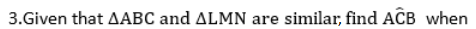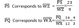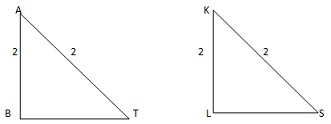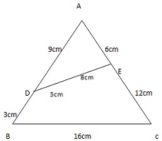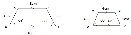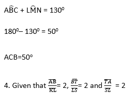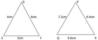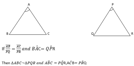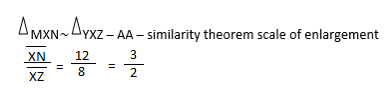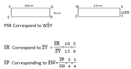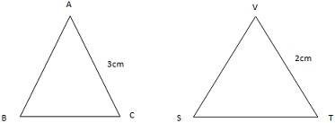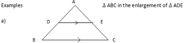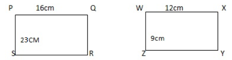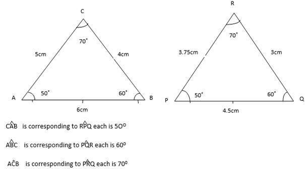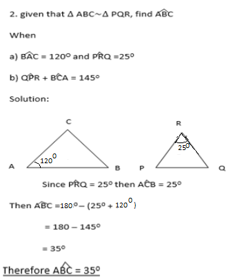 Form 2 Mathematics – SIMILARITY AND ENLARGEMENT msomimaktaba, November 13, 2018August 17, 2024 SIMILARITY AND ENLARGEMENTSimilar figures: Two polygons are said to be similar if they have the same shape but not necessarily the same size.When two figures are similar to each other the corresponding angles are equal and the ratios of corresponding sides are equal.SIMILARTRIANGLE Triangle are similar when their corresponding angles are equal or corresponding sides proportional consider the figure below : Since corresponding angles are equal then the two triangles are similarAlso: Since the ratio of corresponding sides are equal then the two triangles are similarNote () is a sign of similarity, from above ABC PQRExamples1. Given that SLKNFR, identify all the corresponding angles and corresponding sidesSolution: Corresponding sides; 3. One rectangle has length 10cm and width 5cm. The second rectangle has length 12cm and width 4cm. Are the two rectangles similar? ExplainSolution: Therefore; the two rectangles are not similar because the ratio of corresponding sides are not proportional4. A rectangle has length 16cm and width 23cm, A second rectangle has length 12cm and width 9cm. Are the two rectangles similar? Explain Solution: Therefore;The rectangles are not similar because the ratio of corresponding sides are not proportionalConditions for two triangles to be similar;1. Corresponding angles are equal or corresponding sides proportional For other polygons– Corresponding angles equal and corresponding sides proportionalQUESTIONS:a) Given that PQR LMN and that PQRABC identify the corresponding angles and sides between ABC and LMN.solutionExercise Solution: a) ABC = 70O ,MNL = 400 ,ACB =? a) Name the triangles which are similarb) Identify the corresponds anglesSolution:The triangles ABT and KLS are similar8. Name the triangles which are similar to ADC 10. Which of the following figures are always similar?a) circles d) Rhombusesb) Hexagons e) Rectanglesc) squares f) Congruent polygonsSolution:The figures which are always similara) circlesb) squaresExercise 1 M < AEF = 420M < AFE =?900 – 420 = 480M < AFE = 480 INTERCEPT THEOREM A line drawn parallel to one side of a triangle divides the other two sides in the same ratio AAA – Similarity theoremIf a correspondence between two triangles is such that two pairs of corresponding angles are equal then the two triangles are similar SSS – similarity TheoremIf the two triangles is such that corresponding sides are proportional, then the triangles are similarSAS – Similarities theoremIf the two triangles is such that two pairs of corresponding sides are proportional and the included angles are congruent then the triangles are similar PROPERTIES OF SIMILAR TRIANGLESFrom the previous discussion, properties of similar triangles can be summarized as:-1. Corresponding angles of similar triangles are equal2. Corresponding sides of similar triangles are similar3. Two triangles are similar if two triangles of one triangle are respectively equal to two corresponding angles of the other4. Two triangles are similar if an angle of one triangle equals an angle of other and the sides including these angles are proportional.ENLARGEMENTScale enlargementScale – is a ratio between measurements of a drawing to the actual measurement.It is normally started in the form 1: in example if a scale o a map is 1: 20000, then 1 unit on the map represents 20000 units on the groundScale = Examples of scales1. Find the length of the drawing that representsa) 1 stem when the scale is 1:500,000Solution:1:500,000 means 1 cm on the drawing represents 500,000 cm on the actual distance = 500,000x = 1500,000X = X = 3cmThe drawing length is 3cmb) 45km when scale is 1cm to 900mSolution:Scale = 1: 90000Scale = X = The drawing distance is 50cm2. Find the actual length represented bya) 3.5cm metres when the scale is 1: 5000mSolution:Scale = = y = 5000 x 3.5y = 17500cmy = = 175mThe distance is 175mb) 1.8mm when the scale is 1cm to 500metresSolution:Scale = = v= 0.18 x 50000v = 9000cmv = 90mThe actual length is 90mExercise:1. Find the length of the drawing that representsa) 200m when the scale is 1cm to 50metersScale = == X = 4cmThe length of drawing = 4cm b) 1.5 when the scale is 1cm to 100metres= x = 15cmThe length of drawing = 15cmd) 1600km when the scale is 1mm to 1km == x = 1600km The length of drawing is 1.6 mme) 10m when the scale is 1: 500= = x = 2cmThe length of drawing= 2cm2. Find the actual length represented bya) 13.15mm which the scale is 1: 4000Scale = =x = 0.0032875mmb) 3.78cm when the scale is 1mm to 50km = = x = 0.00000007563. On a scale drawing the length of a ship is 42cm. If the actual length of the ship is 84cm, what is a scale if width of the ship is 23cm, what is the corresponding width of the drawing?Solution:Scale = == x = 1:200Scale = 1:200== x = 11.5cmThe corresponding width of drawing = 11.5cm ENLARGEMENTWhen two figures are similar, one can be considered the enlargement of the other (a)b) Square ABCD is the enlargement of PQRSc)The larger circle is the enlargement of smaller circleExample 1. State whether ABCD is the enlargement of PQRS Solution:Since the correspond side are in the ratio 0f 2:1 and corresponding equal then ABCDPQRSScale factor:If two polygons are similar and the ratio of their corresponding sides is 5:3, then the enlargement scale is 5/3ExampleFind the scale of enlargement hence calculate Solution: Scale factor for areasIf two polygons have a scale factor of K then the ratio of the areas is K2ExampleIf ABSVST and the area of STV is 6 square cm. find the area of ABC Exercise1. Two triangle are similar but not congruent. Is one the enlargement of the others one triangle is the enlargement of the other2. The length of rectangle is twice the length of another rectangle. Is one necessary an enlargement of other. Explain? No, Since the width are not necessarily in the same proportional as the lengths.3. In figure below, show that PQR is not an enla