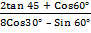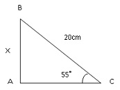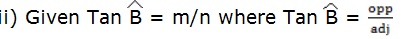 Form 2 Mathematics – TRIGONOMETRY msomimaktaba, November 13, 2018August 17, 2024 TRIGONOMETRYTrigonometric ratioIntroduction: TRI – is the Greek word which means three.-Trigonometry is the branch of mathematics which deals with measurement.-A Trigonometric ratio consists of three parts that is – Hypotenuse, Adjacent and opposite.Consider the diagram below which is the right angled triangle For example Assume angle BFor trigonometrical ratios we have sine, cosine and tangents which used to find the length of any side and angles.Refer to the right angled triangle below:- For sine(sin) Sin  = For cosine (cos)Consider the diagram Cos  = For Tangents (tan)Tan  = whereAC is called AdjacentBC is called OppositeTan  = In summarySOTOCAHAH Where: S – sine, T – tan, C – cos, O –opposite, A – adjacent, H – oppositeExample 1.Find a) Sin Âb) Cos  and (c) tan ÂSolution: a) Sin  = Sin  = Sin  = b) Cos  = Cos  = Cos  = c) Tan  = Tan  = Tan  = Example 2Find the value of sin Â, cos  and tan ÂSolution: Where Opposite = 4, Adjacent = 3, Hypotenuse =?Use Pythagoras theorema2 + b2 = c242 + 32 = c2= c = 5Sin  = = Cos  = = Tan  = = Example 3i) If the sin  = find the value of(a) Cos  , (b) Tan ÂSolution:given sin  = where sin  =By using Pythagoras theorema2 + b2 = c2(45)2 + b2 = (53)22025 + b2 = 2809b2 = 2809 – 2055= b = 28a) Cos  = = b) Tan  = = Solution: from Pythagoras theorema2 + b2 = c2 m2 + n2 = c2(m + n)2 – 2mn = c2 = c = a. Sin B= = b. Cos  = = Example 4If cos y = Find (a) sin y (b)tan ySolution:Given that Cos y = But cos y = a2 + b2 = c2a2 + (21)2 = (29)2a2 + 441 = 841a2 = 841 – 441 = a = 20a. Sin y = = b. Tan y = = Special anglesThe trigonometrical ratios has the special angles which are 0°, 30°,45°, 60°, and 90°.The special angles does not need table or calculator to find their ratios.To prove the value of trigonometric ratio for special anglesConsider the diagram belowNote:when the point B move toward the point c the angle of A = 0° and the length of AB = AC and BC = 0Sin 0° = Sin = Sin 0° = Sin 0°= 0Tan 0°= Tan 0° = Tan 0°= 0Cos 0° = Cos 0° = But AC = ABCos 0°= 1Consider the diagramIf the point A moves towards point C the difference from A to C becomes zero. The angle between A and C become 90° Sin 90° = but opp = hyp Sin 90° = 1Cos 90° = Cos 90° = Cos 90° = 0Tan 90° = Tan 90° = Tan 90° = (undefined)ExampleFind sin 45°, cos 45, and Tan 45° consider a right angled triangle ABC with 1 unit in length The length Of AC = CB = 1 unit But use Pythagoras theorem to find the length AB.From Pythagoras theorema2 + b2 = c212 + 12 = c2= c=Sin 45 ° = Sin 45° = Rationalize the denominatorSine 45° = = = Cos 45° = Cos 45° = Cos 45° = = = Tan 45° = Tan 45° = Tan 45°= 1Find Sin, Cos and Tan of (30° and 60˚)Consider the equilateral triangle ΔABC Use Pythagoras theorema2 + b2 = c212 + b2 = 22b2 = 22 – 12b2 = 4 – 1= b = Sin 60 = Sin 60° = Sin 60° = Cos 60 = Cos 60° = or 0.5Cos 60° = or 0.5Tan 60° = Tan 60° = Tan 60° = Sin 30° = Sin 30° = or 0.5Tan 30° = Tan 30°= = Tan 30° = Cos 30° = Cos 30° = In summary:Sin 0 = Sin 0 = Sin 0 = 0Example 1.Find the value of 4 sin 45° + 2 tan 60 without using tableSolution:4 sin 45° + 2 Tan 60°= 4 () + 2)= 2+ 2Note:Trigonometry: Is the branch of mathematics that deals with the properties of angles and sides of right angled triangleTRIGONOMETRICAL RATIONS FOR SPECIAL ANGLESTrigonometrical rations for special angles deal with 0°, 30°, 45°, 60°, 90°.A0°30°45°60°90°Sin A01Cos A10Tan A01Example 1.Without using mathematical table evaluate(i) 4 sin 45° + cos 30°(ii) 4 tan 60° – Sin 90°Solution:i) 4 sin 45° + Cos 30°= 4 x + =2+ =4(ii) 4 tan 60° – sin 90Solution:4 tan 60° – sin 90= 43 – 1(iii) 3(cos60° + Tan 60°)Solution:= 3(+ 3)= 3= = Example 2Find the value of without using mathematical tableSolution:2 + 33 EXERCISE1. Evaluate the following without using mathematical table(a). 3 sin 45° + 7tan 30°(b). Solution:3sin 45° + 7tan 30°= 3 x + 7 x 3= 3 x + 7 x 3= TRIGONOMETRIC TABLES– Trigonometric tables deals with readings of the value of angles of sine, cosine and tangent from mathematical table when they are already prepared into four decimalHOW TO READ THE VALUE OF TRIGONOMETRIC ANGLES FROM MATHEMATICAL TABLES Example 1Find the value of the following by using mathematical table(i) Sin 43°= 0.6820(ii) Sin 58º = 0.8480(iii) Sin 24°42′ = 0.4179(iv) Sin 52°26′ = 0.7923 + 4 = 0.7927Example 2By using mathematical tables evaluate the following(a)Cos 37° =0.7986(b)Cos82° =0.1392(c)Cos 71°34′ =0.3162(d)Tan 20° = 0.3640(e)Tan 68° =2.4751(f)Tan 54°22′ = 1.3950Example3.Find the value of the following letter from trigonometric rations(i) Sin p = 0.6820Sin p = 0.6820P = Sin-1 (0.6820)P = 43°ii) Sin Q = 0.7291Q = Sin-1 (0.7291)Q = 46°48’iii) Tan R = 5.42°45R = 5. 42°45R = tan-1 (5.42°45)R = 79°33 APPLICATION OF SINE, COSINE AND TANGENT RATIOS IN SOLVING A TRIANGLESine, cosine and triangle of angles are used to solve the length of unknown sides of trianglesExampleFromSOTOCAHAH Sine C = Sin 55˚= 20 x Sin 55˚= x20 x 0.8198 = xx = 16.4 cmThe value of x = 16.4cmExample 2Find the length XY in a XYZ Solution:FromSOTOCAHAH tan 62˚ = tan 62° = 13 x tan 62° = xy13 x 1.8807 = xy24.4cm = xyxy = 24.4cmExampleEvaluate the value of m and give your answer into 3 decimal placesFromSOTOCAHAH Cos R = Cos 36° = m = m = m = 14.833 cmThe value of m is 14.833 cmEXERCISE Solution:FromSOTOCAHAH tan 43° = tan 43°=17 x tan 43° = yy = 17 y =15.85cm ALL NOTES FOR ALL SUBJECTS QUICK LINKS:AGRICULTURE O LEVEL PURE MATHEMATICS A LEVELBAM NOTES A LEVELBASIC MATH O LEVELBIOLOGY O/A LEVELBOOK KEEPING O LEVELCHEMISTRY O/A LEVELCIVICS O LEVELCOMPUTER(ICT) O/A LEVELECONOMICS A LEVELENGLISH O/A LEVELCOMMERCE O/A LEVELACCOUNTING A LEVELGENERAL STUDIES NOTESGEOGRAPGY O/A LEVELHISTORY O/A LEVELKISWAHILI O/A LEVELPHYSICS O/A LEVELMOCK EXAMINATION PAPERSNECTA PAST PAPERS Basic M