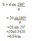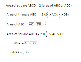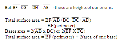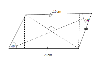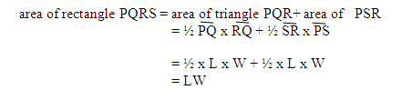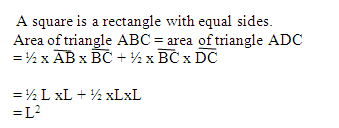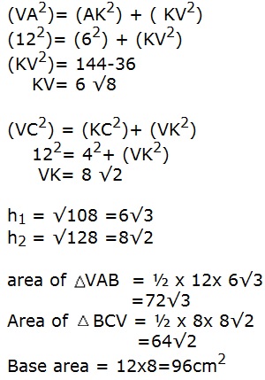 Form 4 Mathematics – AREAS AND VOLUMES msomimaktaba, November 13, 2018August 17, 2024 AREAS AND VOLUMES AREASCASE1.Right angled triangle Area = ½ b x h 2. Triangle with altitude that lies within the triangleArea 0f Δ ABC = ½ bh + ½ d h= ½ h(b + d)= ½ hL3. A triangle where the altitude of triangle lies outside of the triangle.Area of ABC = area of triangle BCD – area of triangle ABD= ½ h (b+d) – ½ h d= ½ h e – ½ h d= ½ h (e-d)In all the triangle the formula is the same.Thus if you were given a triangle with a base b and its corresponding height (altitude) h, its area is equal to ½ b h CASE II We can also use the knowledge of trigonometrical ratios. Area of triangle ABC = ½ b h= ½ b a sin cSin A = h/ch= c sin Athe area of triangle ABC = ½ b c sin AExample1. The length of two sides of a triangle are 8cm and 10 cm. find he area of the triangle, if the included angle is 30 0.Solution; Area = ½ x 10 x 8 x sin 300= 40 x ½Cm2=20cm22. The area of triangle ABC with sides a,b,c. Area of triangle ABC= ½ c b sin A= ½ a c sin B= ½ a b sin CExample The base of triangle PQR is 17 cm long. If corresponding height is 20cm, find the area of the triangle.Solution;Area of triangle PQR = ½ b h= ½ x 17 x 20= 170 cm2Qn. 9what is the area of the paper required to make the kite shown in the figureSolution(i) = ½ x 20 x 20 x sin 40º= 200 x 0.6428=128.56cm2(ii)= ½ x 10 x 10 x sin 500= 50 x 0.7660= 38.3 cm2 AREA OF TRAPEZIUMArea of trapezium ABCD = area of triangle ABC + area required of triangle ADC= L 1 h + L2 h= h(L1 + L2)Examples.1. Calculate the height of trapezium with area 84 square units and bases 16 units and 8 units as shown ; Area = ½ h ( b1+ b2) 84 = ½ h ( 16+ 8) 84 = 12 h h = 7 units.AREA OF PARALLELOGRAM Area of parallelogram ABCD = area of ΔABD + ΔBCD = ½ A B h + ½ C D h = ½ h = ½ h = h x Area of parallelogram = bhAREA OF RHOMBUS A rhombus is also a parallelogram. Area = bh We can also find the area of the rhombus by considering the diagonals of a rhombus. AC and DB are the diagonals. Area of triangle ABC = area of triangle ADC Area of rhombus ABCD= 2 (area of triangle ABC) OR = 2 ( area of triangle ADC) EXERCISE1. 1. Calculate the area of a rhombus whose diagonals are 12dm and 10 dm.2. 2. Calculate the area of the trapezium ABCD shown in the figure below 3. ABCD is a parallelogram with A= 10cm, BAD = 600. Calculate the area of the parallelogram.4. 4. Find the area of trapezium ABCD shown in the figure below; Sin 360 = h/ sSolution4:h = 0.5878x 5 cmh= 2.939 cmarea = ½ x 2.939 (7+5)= ½ x 2.939(12)= 17.634cm2 AREA OF A RECTANGLE AREA OF SQUARE A square is a rectangle with equal sides. Area of triangle ABC = area of triangle ADC Also we can find the area of a square by considering the diagonals.ΔABC = ΔADC Area of triangle ABC = Area of triangle ADC Example1. Find the area of square in which diagonals have length of 12.5cm2SolutionArea = ½ (length of diagonals)2= ½ (12.5) 2= 78.125cm 2TOTAL SURFACE AREA OF A RIGHT CIRCULAR CONE Right circular cone Is the one whose vertex is vertically above the center of the base of the cone.Total surface area of a cone = area of curved surface + base area.BUT; area of curved surface ( lateral surface ) = area of small triangles. If we consider our cone , AB, BC , CD and DC are approximated line segments, hence we have small triangles VAB,VBC , VCD and VDE. Hence area of curved surface = ½ AB x VA + ½ BC x VC + ½ CD x VC + ½ DEx VD But VA= VB = VC = VD = VE Area of curved surface = ½ AxBxL+ ½ BxCxL+ ½ xCx DxL+ ½ DxExL = ½ L (AB+BC+CD+DE) = ½ L (2πR) = πRL Total surface area = πR2+ πRL = πR(R+L)TOTAL SURFACE AREA OF A RIGHT CYLINDERTotal surface area of a right cylinder= area of curved surface+ bases area.= 2πRh + πR2 TOTAL SURFACE AREA OF A RIGHT PYRAMIDA right pyramid is the one which the slant edges joining the vertex to the corner of the base are equal.Total surface area of a right pyramid=area of triangle VAB+ VBC+VDC+VDA + area of the base.= lateral surface + area of the base.BUTAs VAB, VDC, VBC and VDA are isosceles triangles. Then VA,VB,VC and VD are slant height.ExampleConsider the data below of a right pyramid. Find the total surface area of the pyramid.Total surface area of a pyramid= area of laterals + base area=area of ΔVAB+ ΔVBC+ ΔVDC+ ΔVDA+ base areaEXERCISE1. The radius of a base of right circular cylinder is 7dm and height is 10 dm. find;(a). The total surface area.Solution: The total surface area = 2πR (h+r) = 2 x 3.14 x 7 dm (10+7) = 74.732 dm2 2. Calculate the lateral surface area of the right cone shown below. = πr(r+L) = 3.14×3.5x(3.5+1.6) = 3.14×3.5×19.5 = 214.305cm2THE TOTAL SURFACE AREA OF A RIGHT PRISMA right prism is a prism in which each of the vertical edges is perpendicular to the plane of the base. an example of right prism is shown in the figure below where EABF, FBSG, HDCG and EADH are faces made up the lateral surface. and ABCD and EFGH are bases. A right prism is a prism in which each of the vertical edges is perpendicular to the plane of the base. an example of right prism is shown in the figure below where EABF, FBSG, HDCG and EADH are faces made up the lateral surface. and EFGH are bases. The total surface area of a prism ABCDEFG= Area of lateral surface + base area ExampleFind the total surface area of a rectangular prism 12cm long,8 cm wide, and 5 cm high. soln Surface Area = BF(ABxBC)2 =5( 12 x8) 2 = 5cm x 192cm =960 cm2Base area = 12×8 x2 = 192 cm2 . : Total surface area = 240 cm2 +192 cm2 = 432 cm2Exercise 1. The altitude of a rectangular prism is 4cm and the width and length of its base are 12cm and 3 cm respectively. Calculate the total surface area of the prism.2. One side of a cube is 4dm. calculate a. The lateral surface area. b. Total surface area.3. Figure below shows a right triangular prism whose base is a right angles triangle. Calculate its total surface area. 4. The altitude of a square pyramid is 5units long and a side of the base is 5 units lo